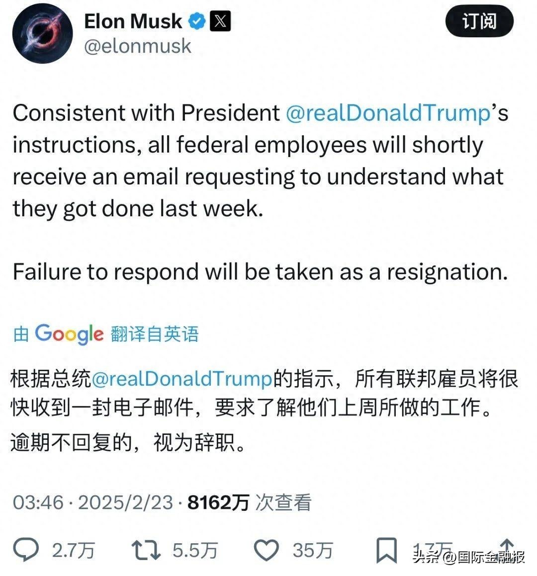 2月23日,马斯克在社交媒体平台X(原Twitter)上发布了对联邦雇员的新要求。他表示,所有联邦雇员将收到一封邮件,邮件的主题简洁明确:“你上周做了什么”,并要求他们列出“上周完成的五个工作要点”,并在周一晚11:59前回应。如果未作回应,将被视为自动辞职。